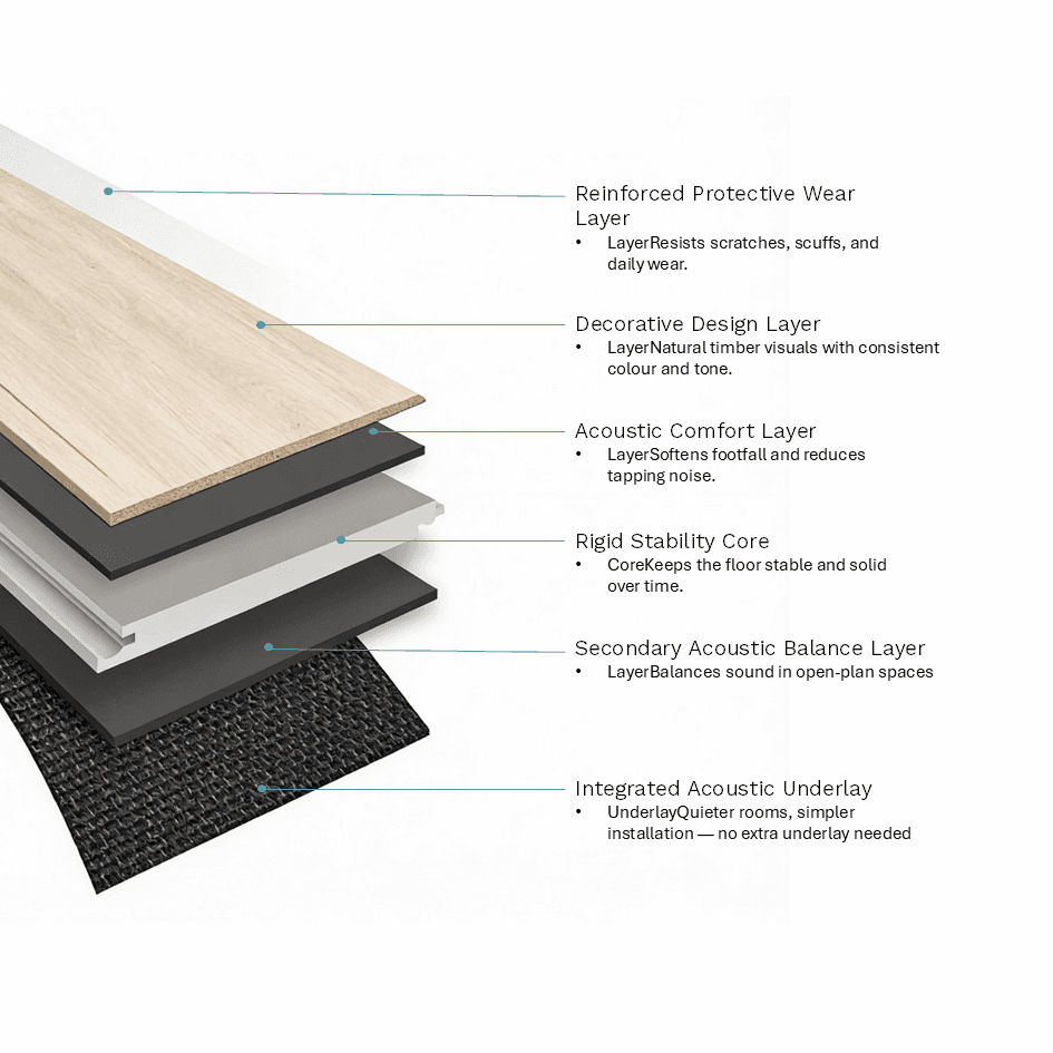 Standard hybrid floors can sound hollow, especially upstairs or over concrete. CloudStep softens every step, reduces echo, and still gives you the warmth and texture of timber — without the upkeep, the coldness of tiles, or the noise of cheaper hybrids.