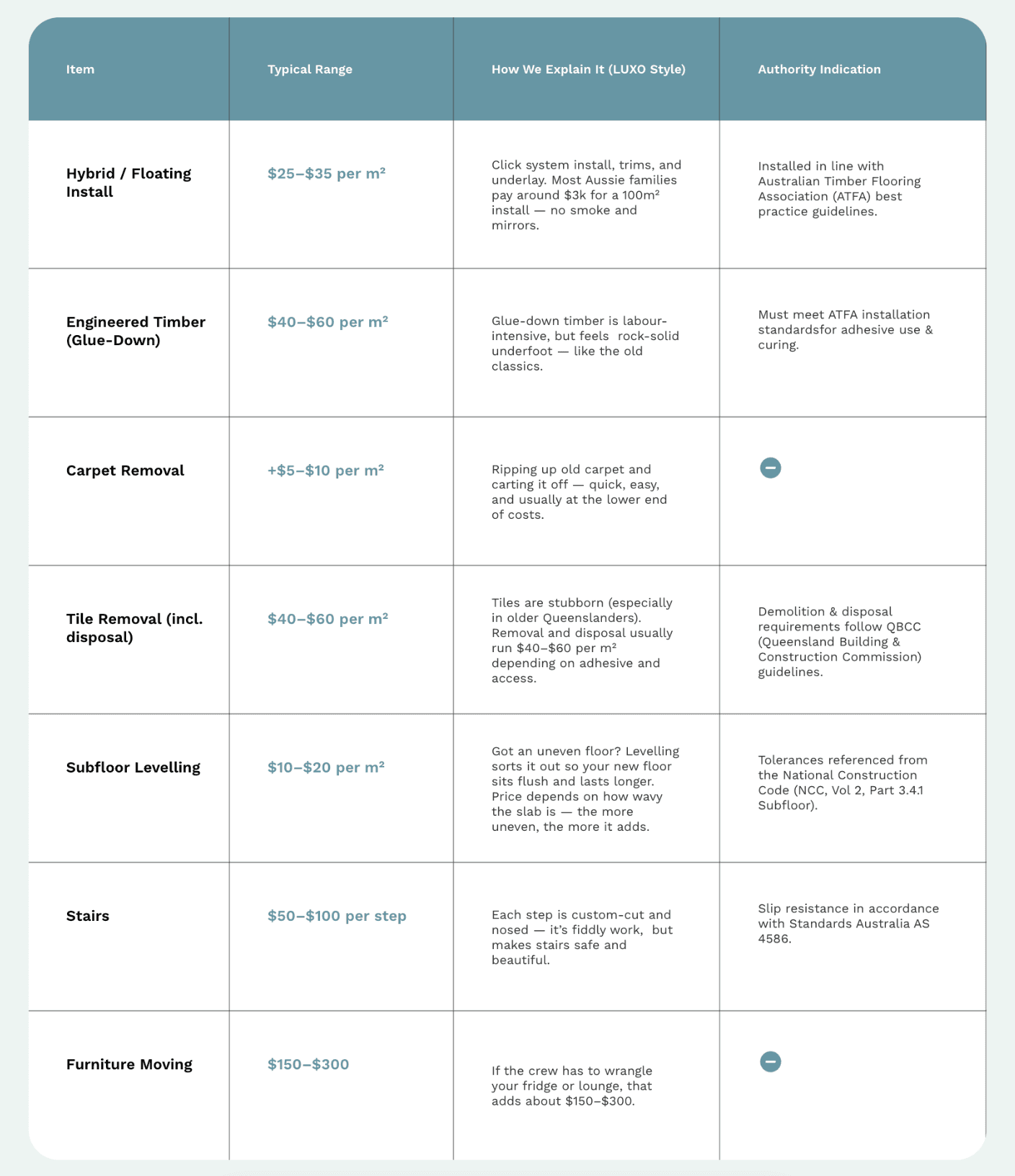 Click system install, trims, and underlay. Most Aussie families pay around $3k for a 100m² install — no smoke and mirrors.